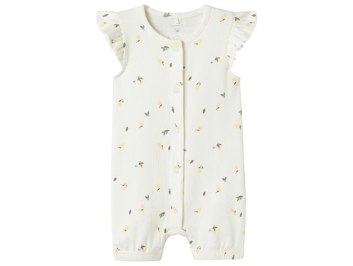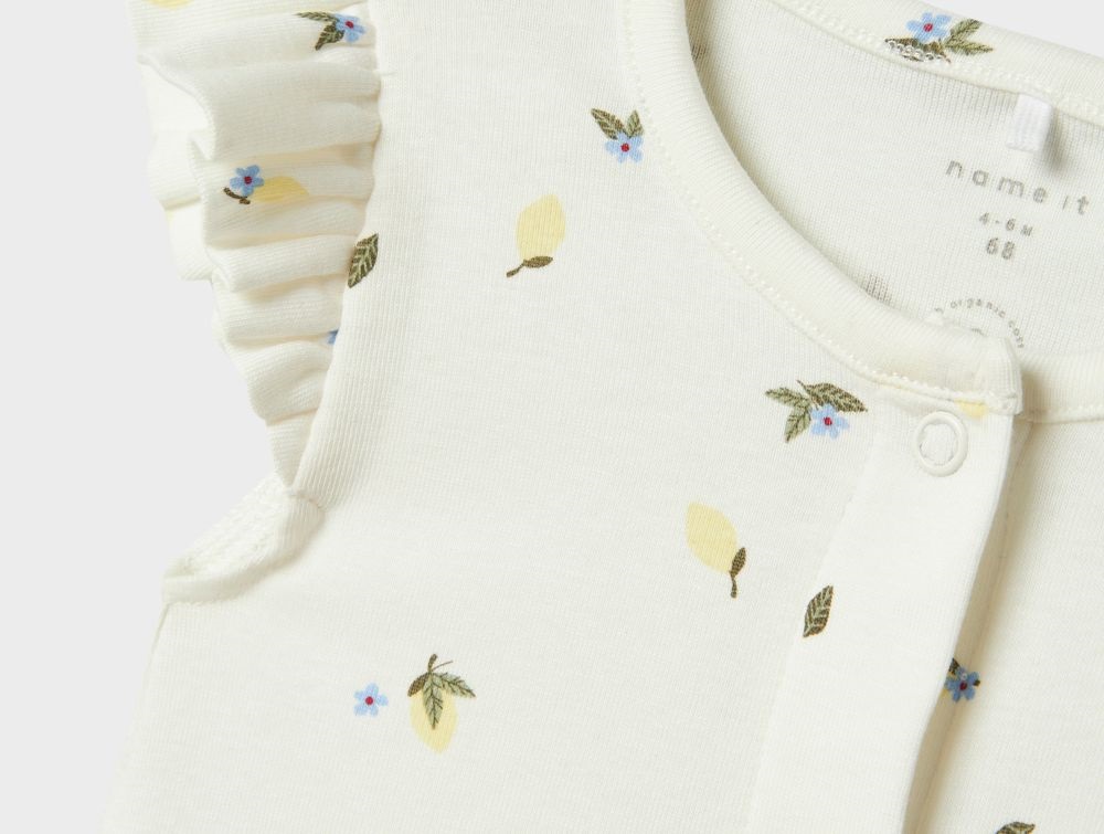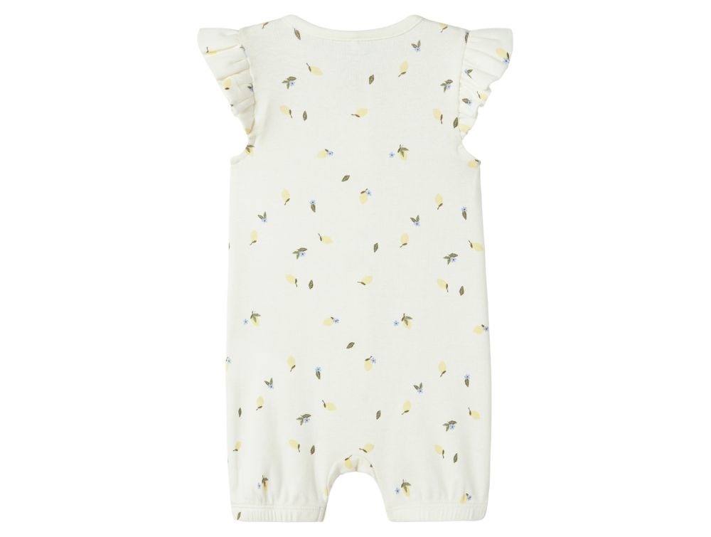 Sommerdragt i en hvid nuance med et fint print af små blå og gule blomster. Dragten har korte ben med smal elastik forneden og små flæseærmer, der lige dækker skuldrene. Den lukkes midt foran med trykknapper, så den er nem at tage af og på. Den bløde og strækbare kvalitet sikrer en behagelig og fleksibel pasform for de mindste.