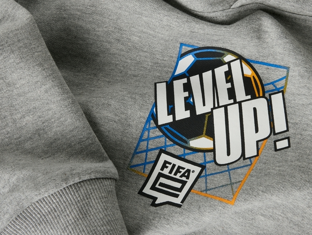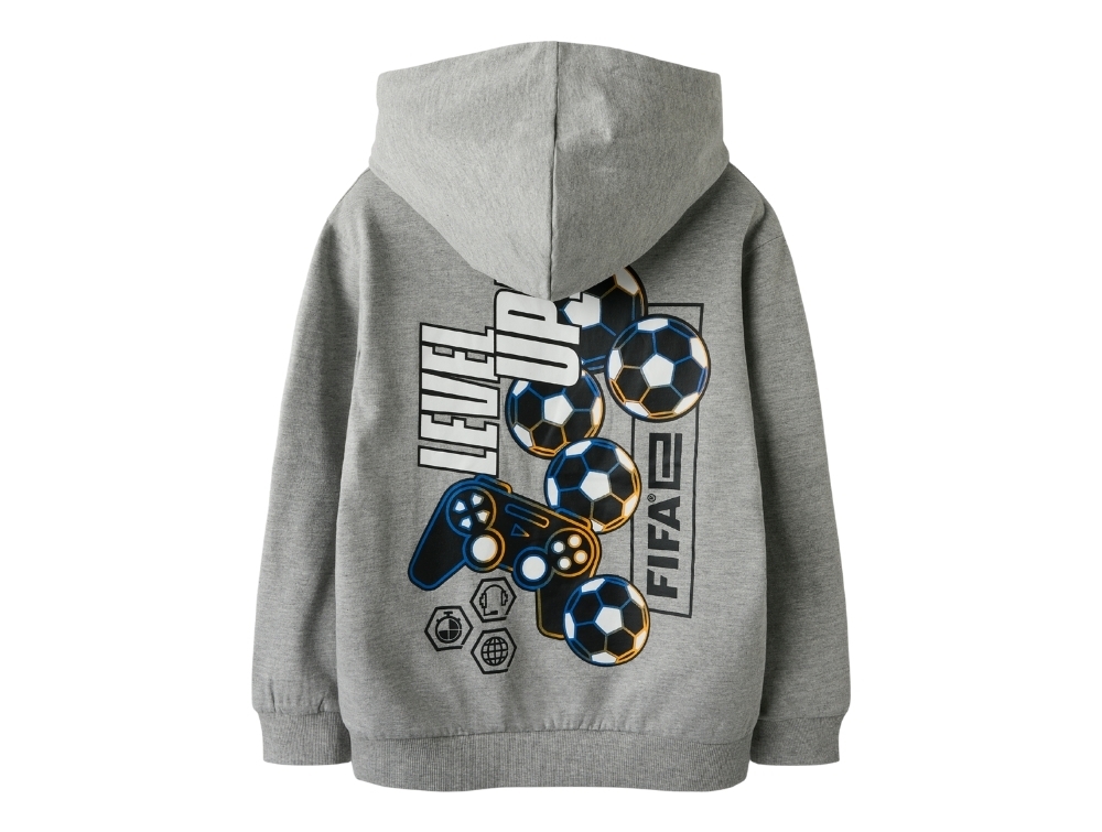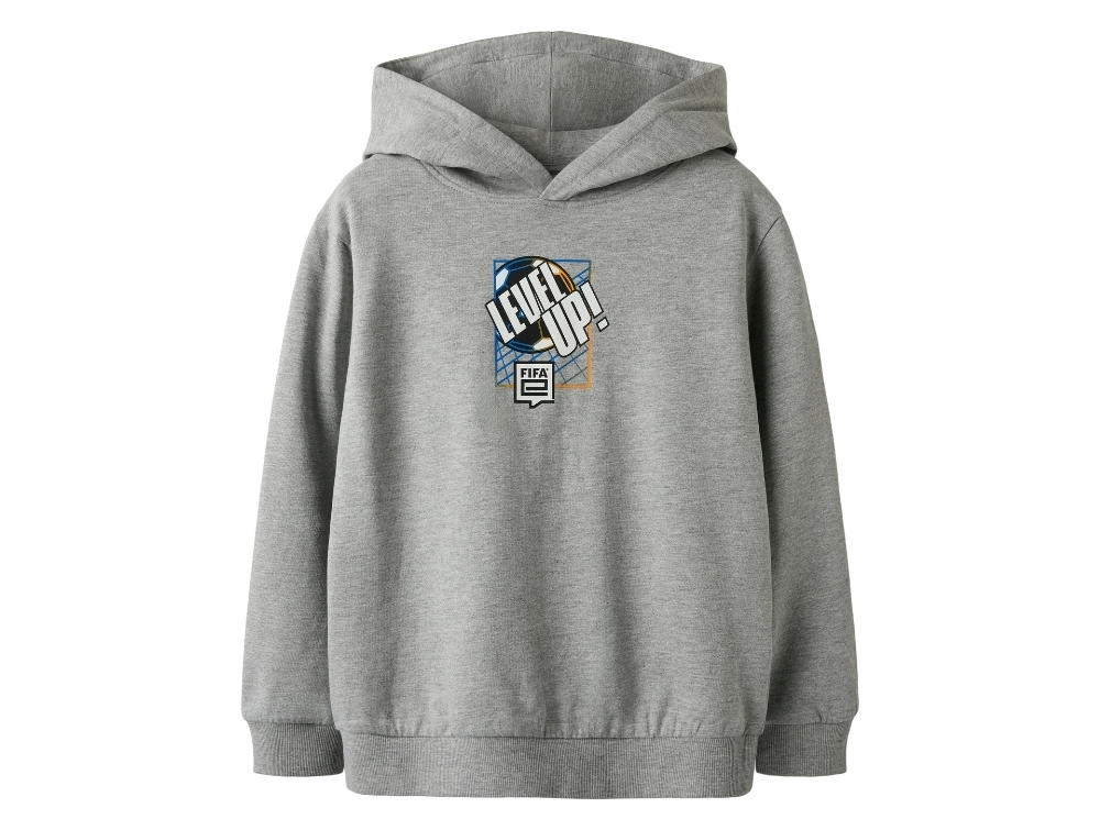 Grå hoodie fra Name It med cool Fifa “Level Up” print på både for- og bagside.