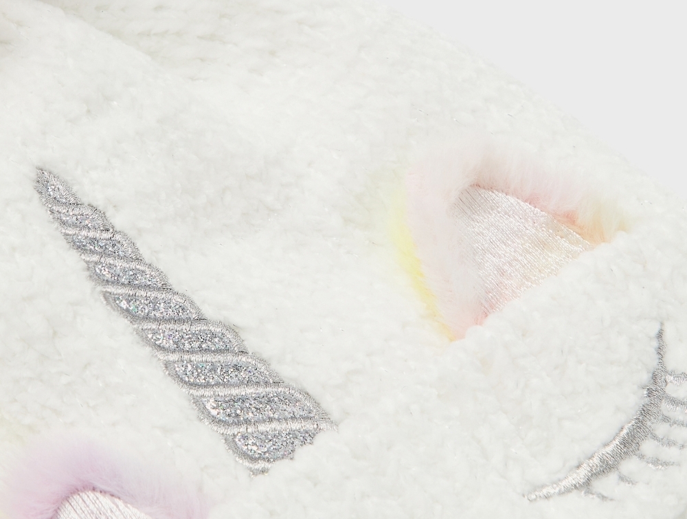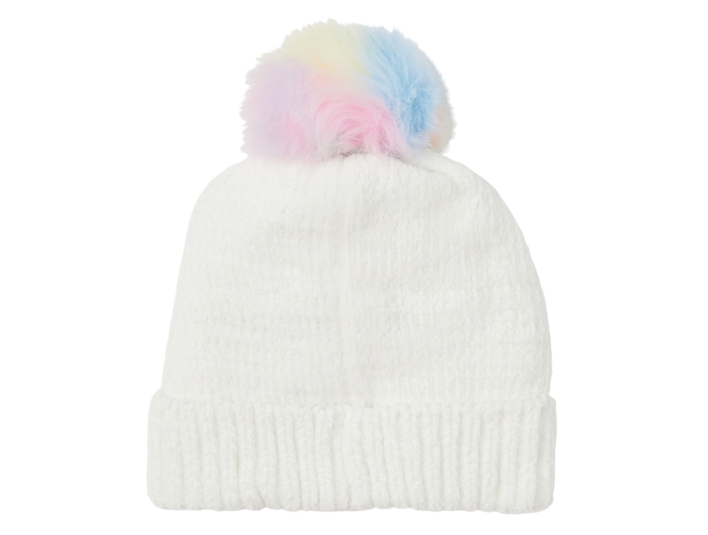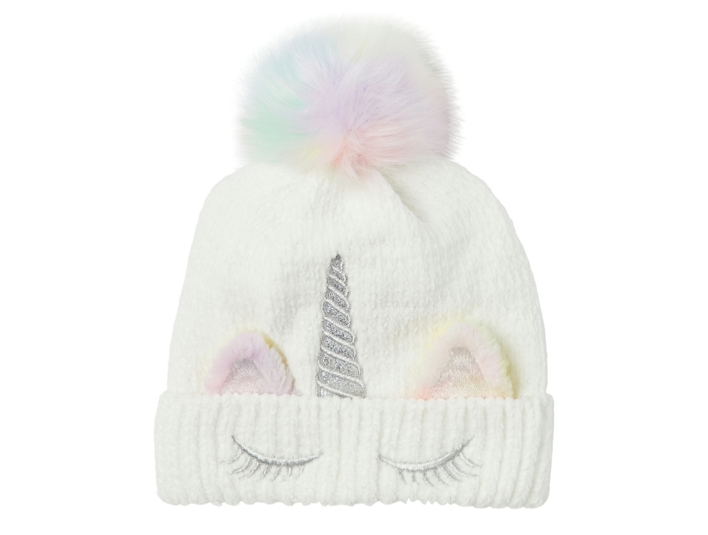 Strikket i 100% polyester med blød foring, broderet enhjørningedetalje og farvet pompon på toppen.