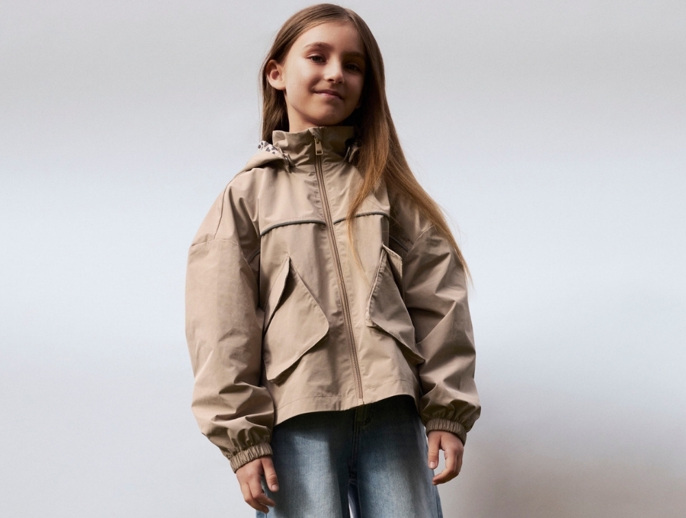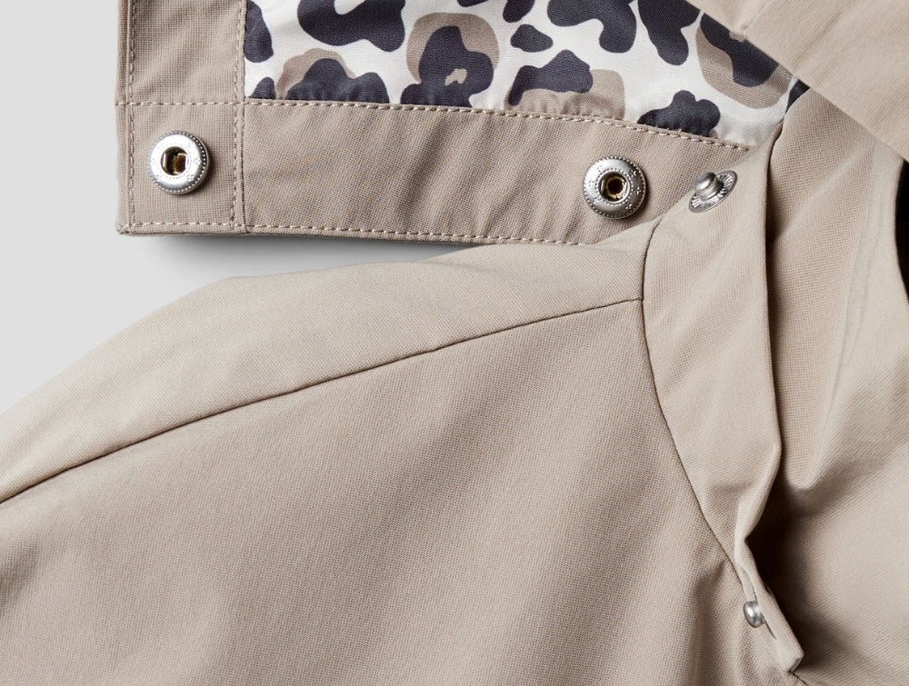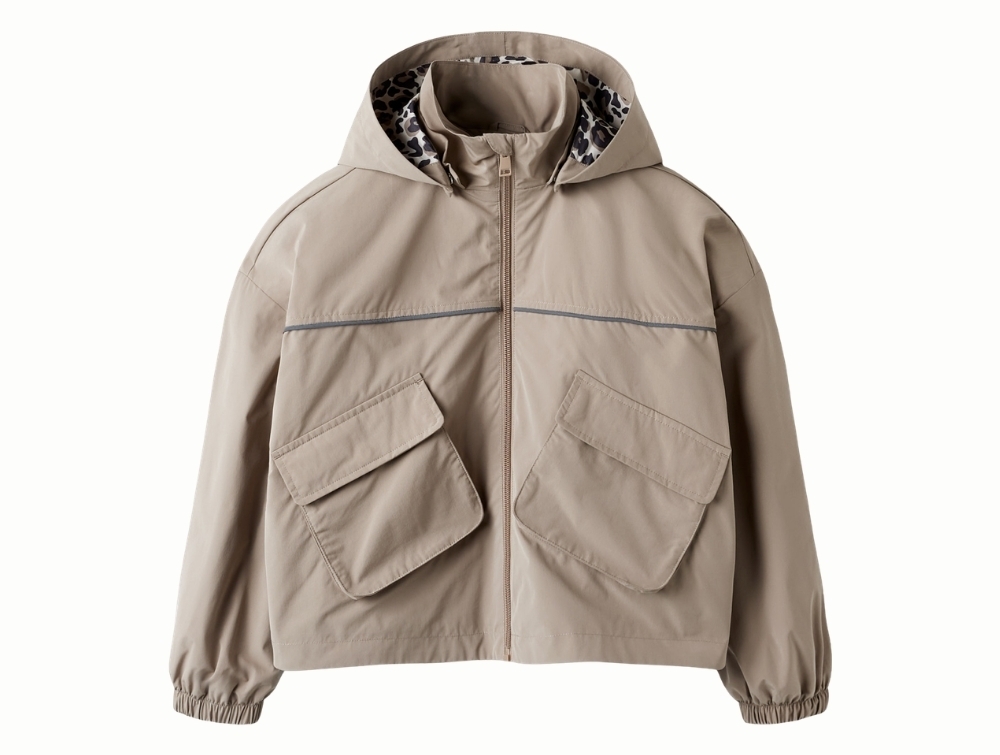 Modellen har høj hals, aftagelig hætte og diskrete refleksdetaljer, som gør den velegnet som overgangsjakke. Indvendigt i hætten ses et leopardmønstret foer, der giver en fin kontrast. Jakken har almindelig pasform og en let, praktisk konstruktion.