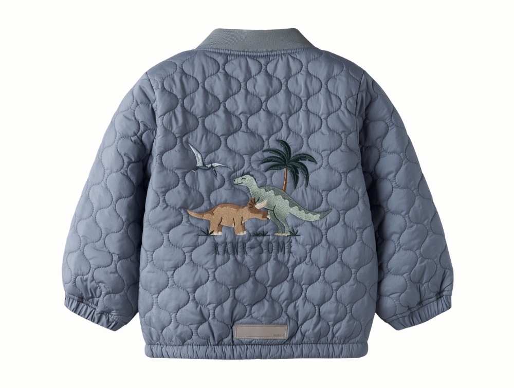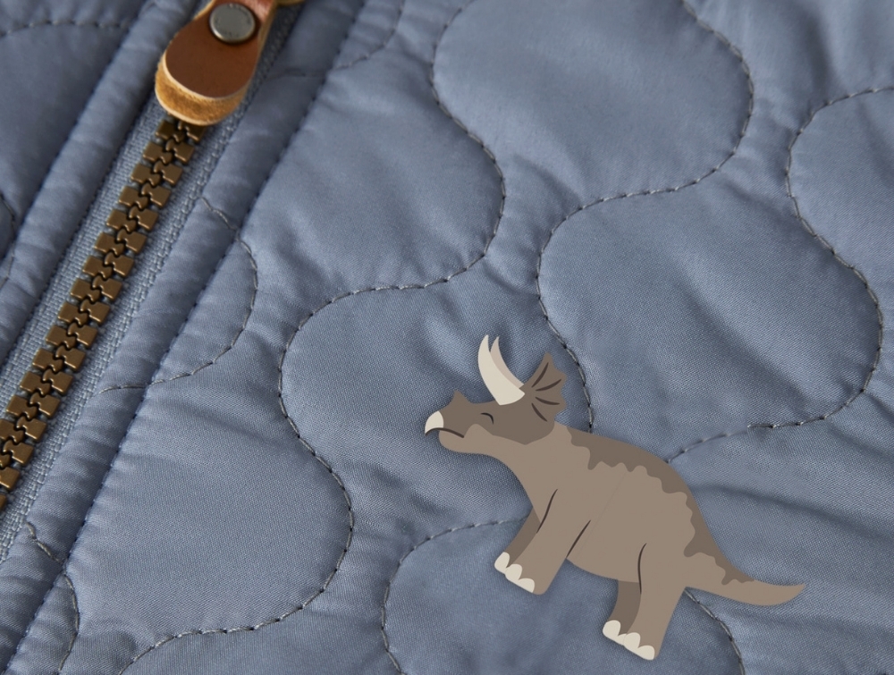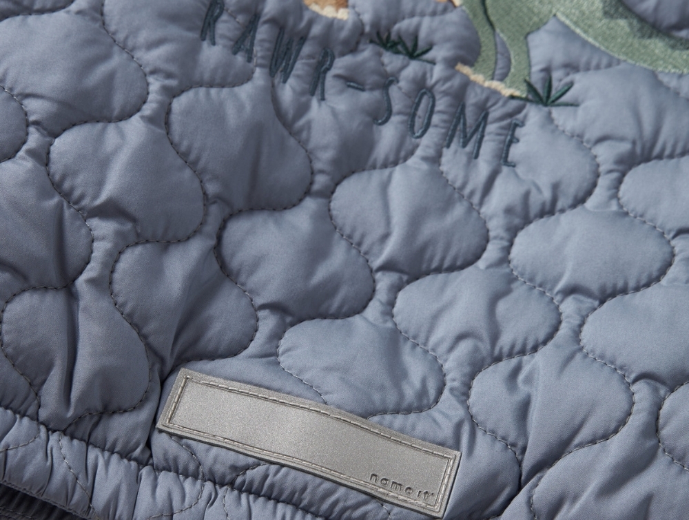 Quiltet jakke i blå nuance (Flint Stone) fra Name It med fine dinosaurdetaljer foran og stort broderi på ryggen.