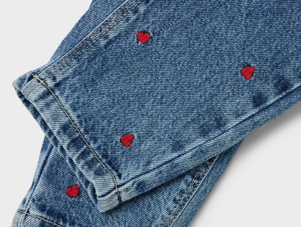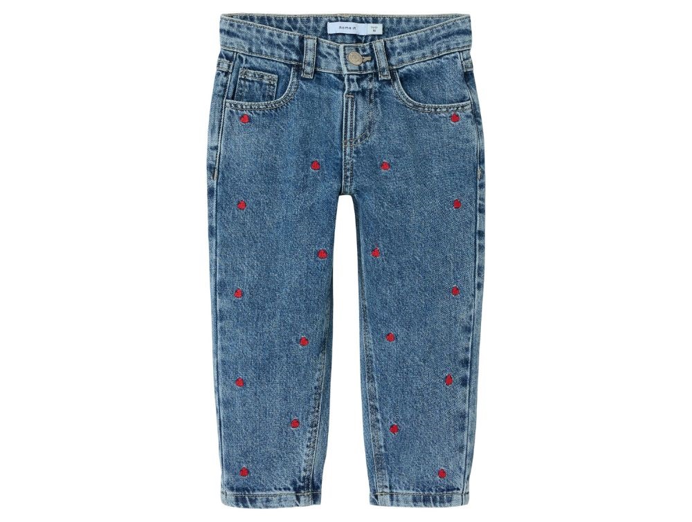 Komfortable og stilfulde jeans fra Name It i en klassisk mellemblå denimfarve. Bukserne har en løs pasform omkring benene og en mere tilpasset pasform ved hofterne, hvilket skaber et afslappet og moderne mom fit-look. Bukserne er dekoreret med et rødt broderi af små hjerter, der tilføjer en fin detalje.