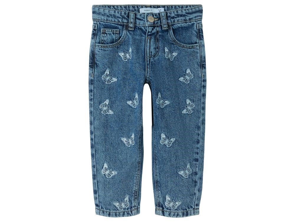Komfortable og stilfulde jeans fra Name It i en klassisk mellemblå denimfarve. Bukserne har en løs pasform omkring benene og en mere tilpasset pasform ved hofterne, hvilket skaber et afslappet og moderne mom fit-look. Bukserne er dekoreret med et lyseblåt broderi af små sommerfugle, der tilføjer en fin detalje.