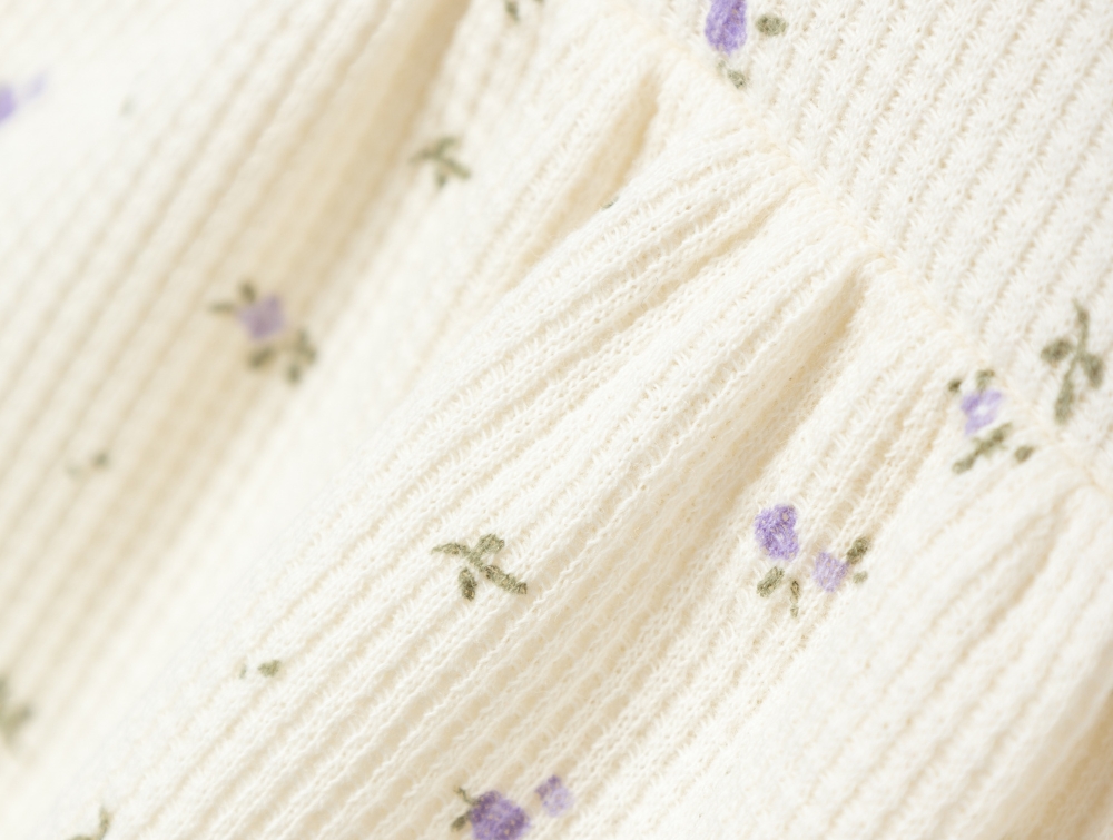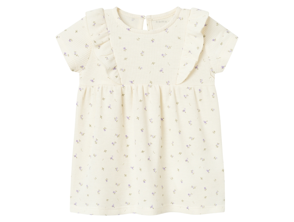 Kortærmet kjole i farven jet stream med blomsterprrint og flæser fra Name It.