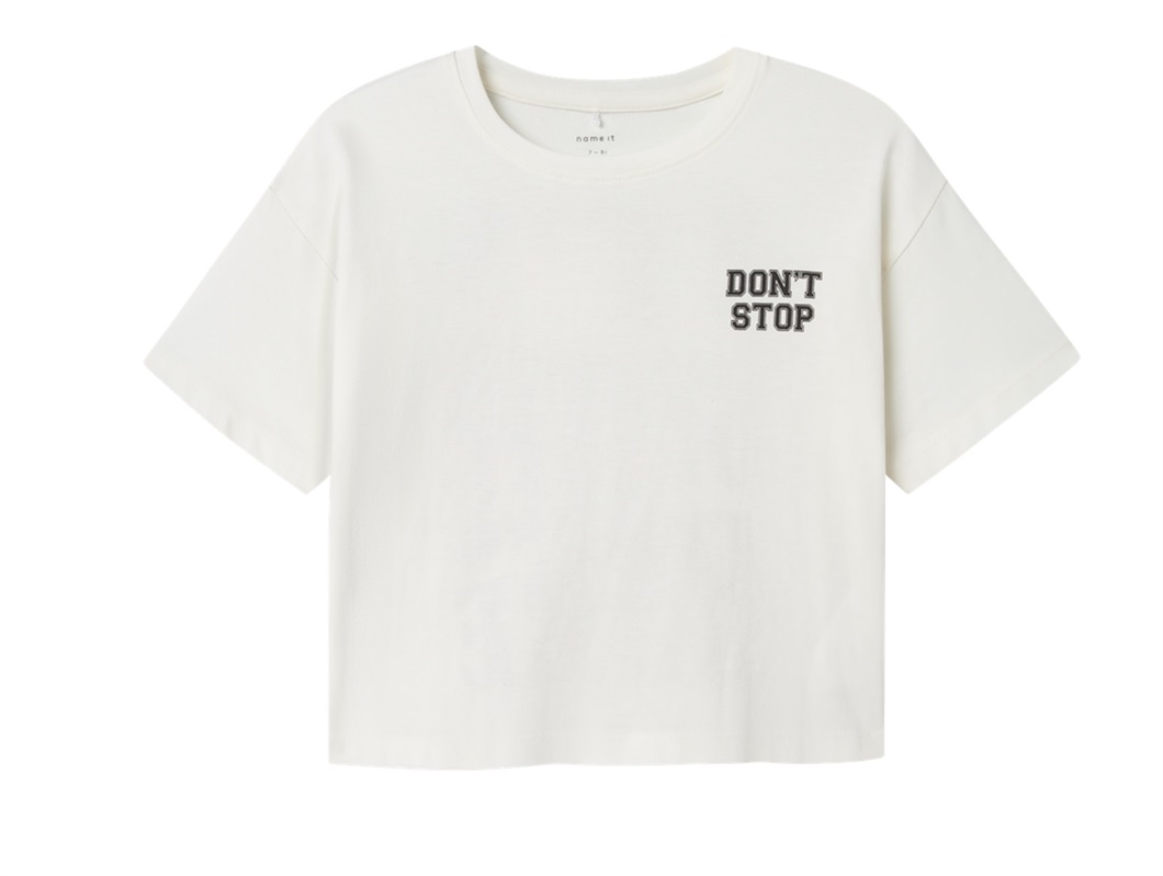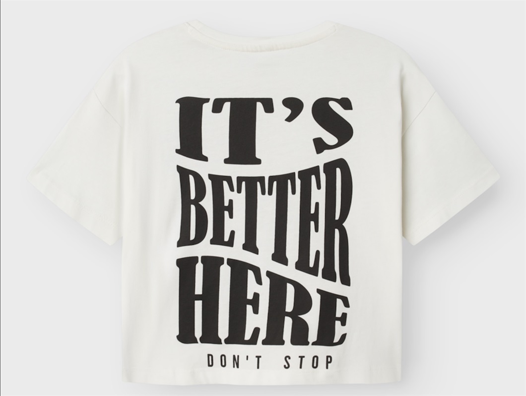 Kort boxy t-shirt i farven jet stream med tekstpant på front og ryg fra Name It.
