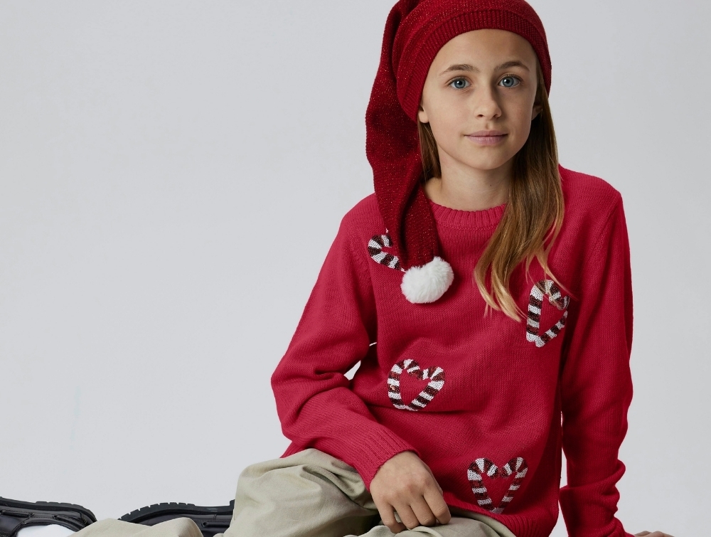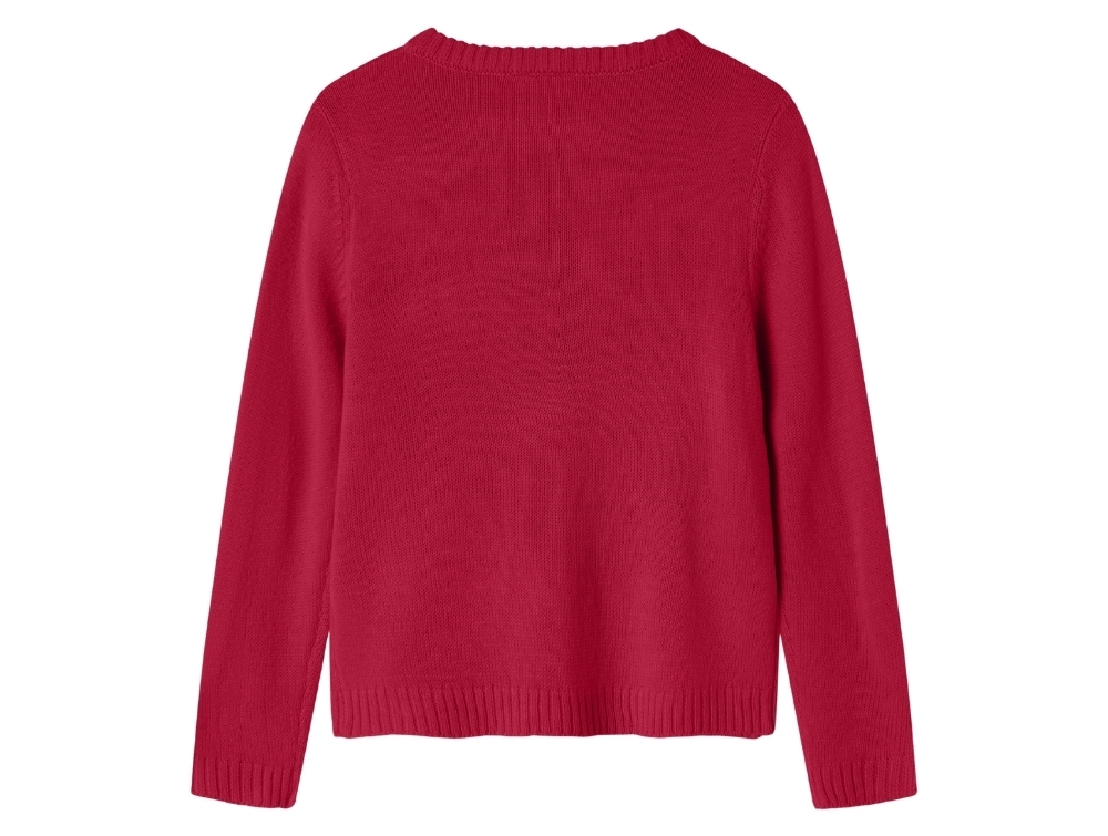 Pige iført Name It juletrøje i rød med paliet hjerterName It juletrøje i jester red med paliet hjerterDetalje af paliet hjerte på Name It juletrøjeBagside af Name It juletrøje i rød
