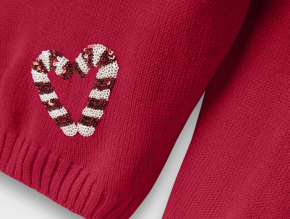 Strikket model med påsyede jule-slikstokke i palietter, der er formet som hjertemotiver.