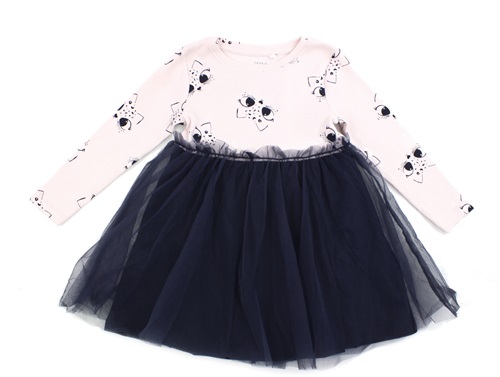 Kjole i sart rosa med katteprint og mørkeblåt tylskørt fra Name It.