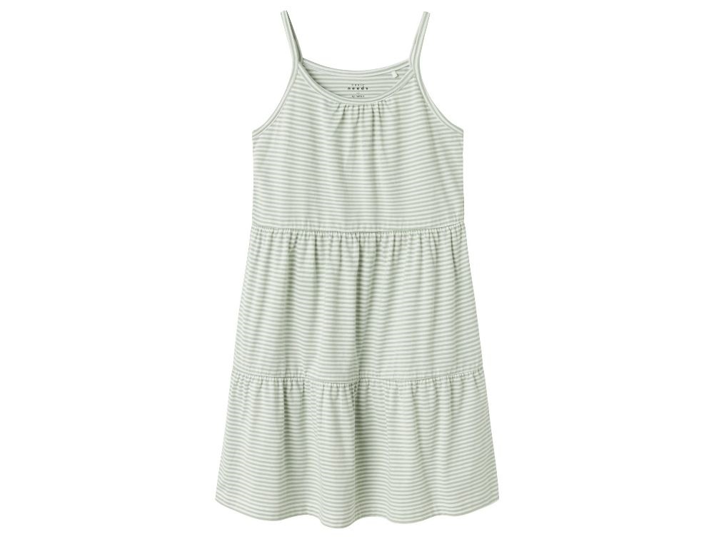 Kjole i lysegrønne og hvide striber fra Name It med tynde stropper og søde rynkedetaljer – en let style til varme dage.
