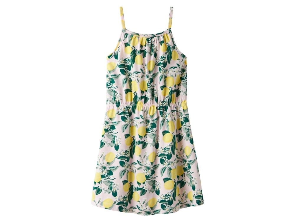 Denne ærmeløse sommerkjole er fremstillet i blød bomuldsjersey med rund hals og tynde stropper. Kjolen har et smock-syet taljestykke og vidde i skørtet, hvilket giver en let og luftig silhuet.