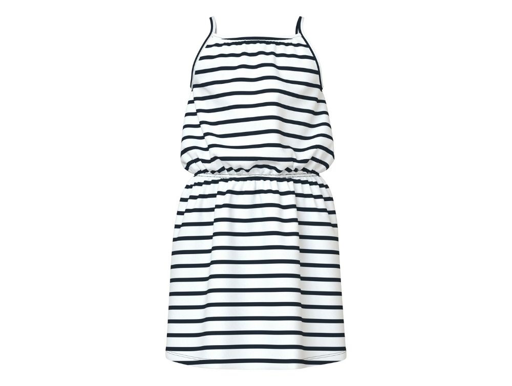 Kjole med hvide og mørkeblå striber og smalle stropper fra Name It i en blød bomuldskvalitet.