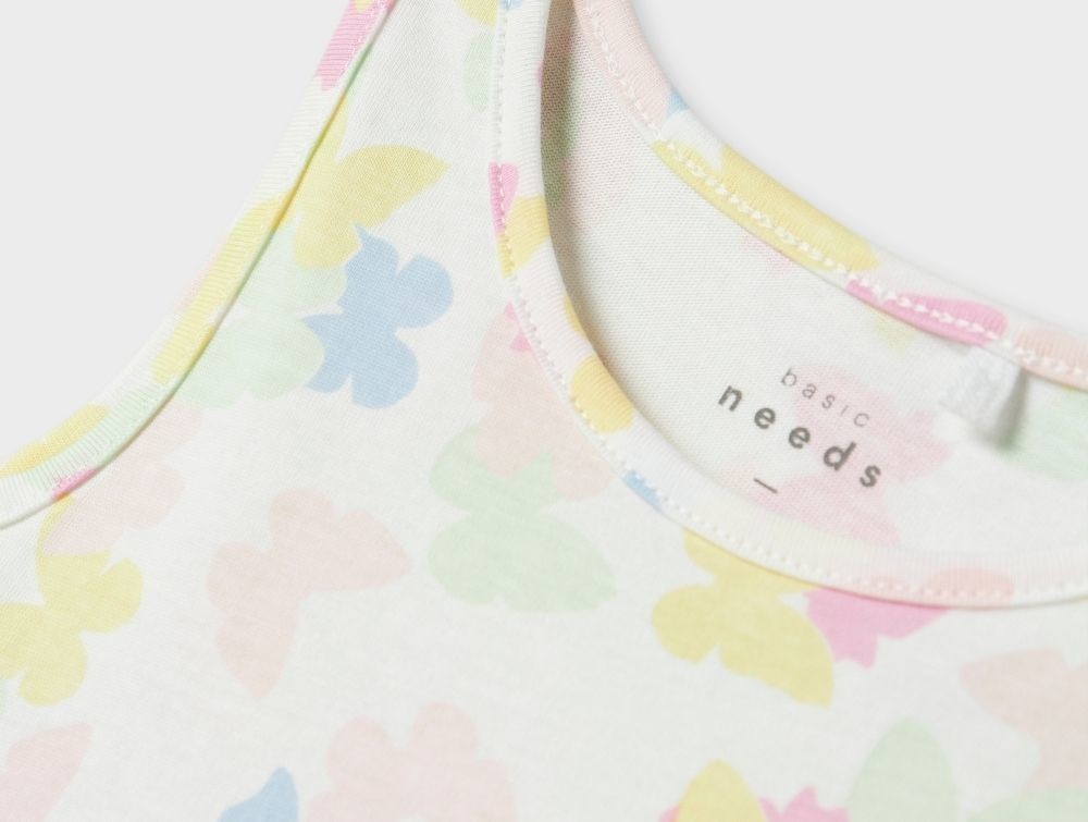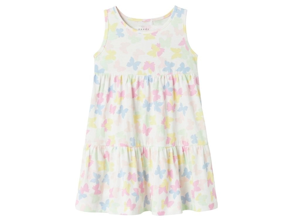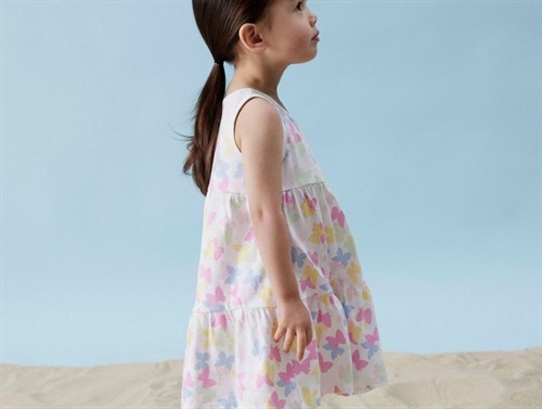Pige i hvid Name it kjole med print af pastelfarvet sommerfugle 13228172 bright white butterflies Hvid kjole fra Name It med sommerfugleprint i pastelfarver 13228172 bright white butterfliesSommerfugleprint på hvid kjole fra Name It 13228172 bright white butterflies