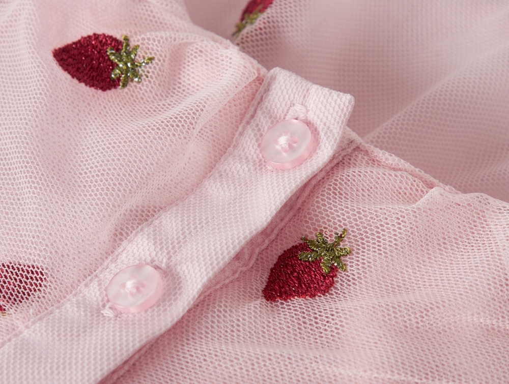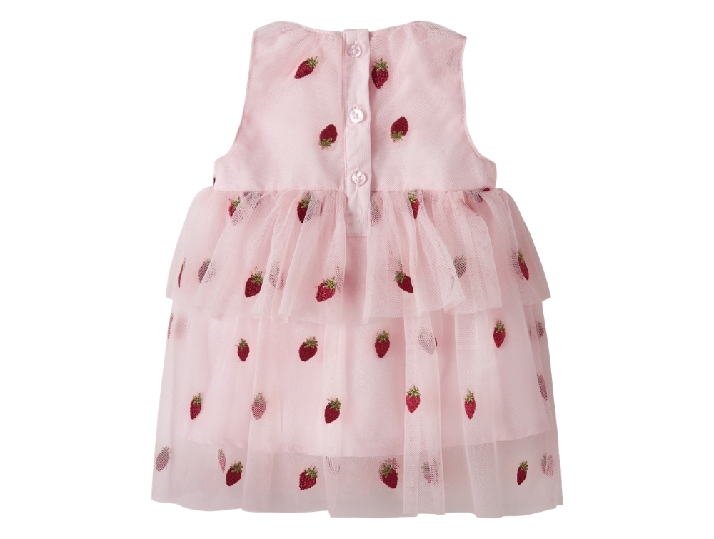 Designet er ærmeløst med rund hals og knaplukning bagpå. De lagdelte tylskørter giver bevægelse, mens jordbærbroderiet tilfører et dekorativt og enkelt udtryk.