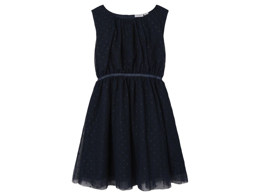 Smuk spencer-kjole fra Name It i en mørk sapphire-nuance med tone-i-tone detaljer og et elegant glitterbånd i taljen. Kjolen er lavet i let tyl, der giver et festligt udtryk, og har en blød polyesterforing, så den ikke er gennemsigtig.