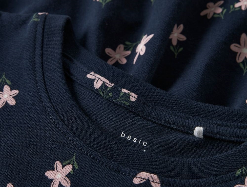 Kjole i en klassisk mørkeblå nuance med print af lyserøde blomster, lavet i blød og strækbar jersey. Modellen har en fin overskæring, der skaber et let rynket skørt med feminint udtryk.