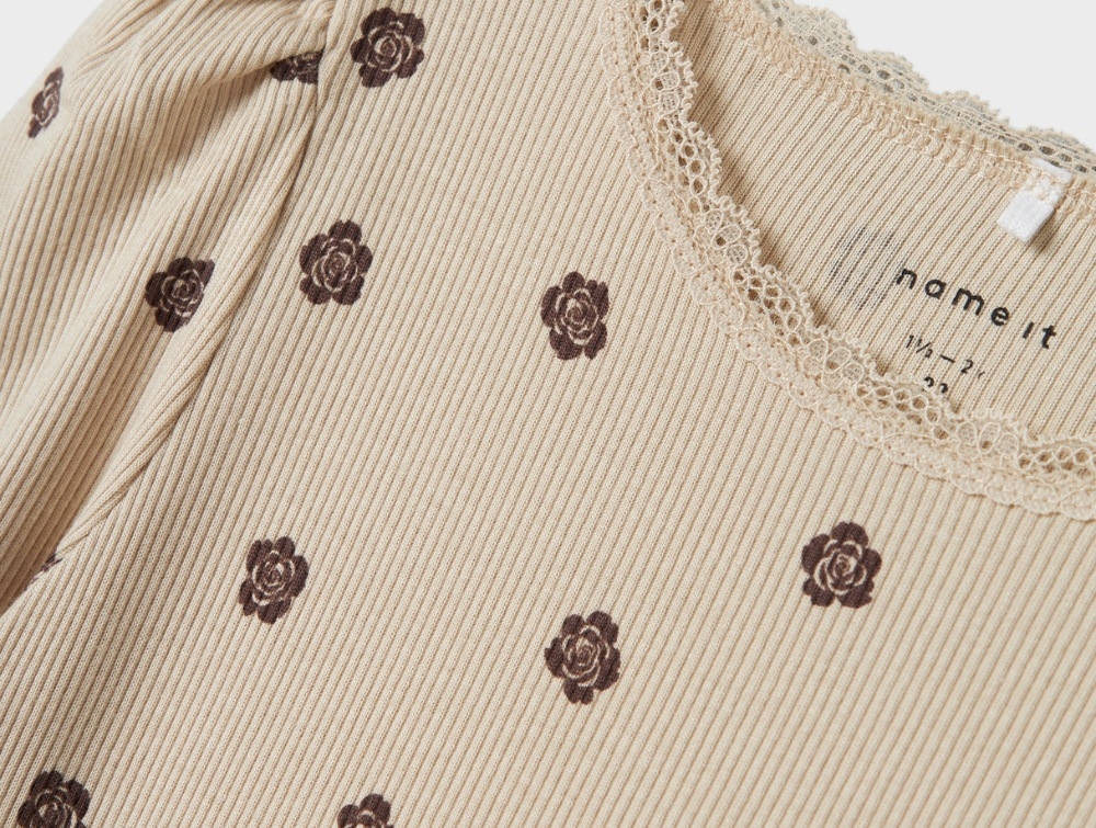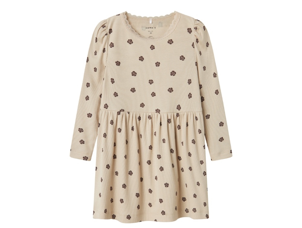 Sød kjole i beige nuance (peyote) fra Name It med små brune blomster trykt over hele stoffet. Kjolen har lange ærmer med let puf og en fin blondekant ved halsen, der giver et feminint og klassisk udtryk.