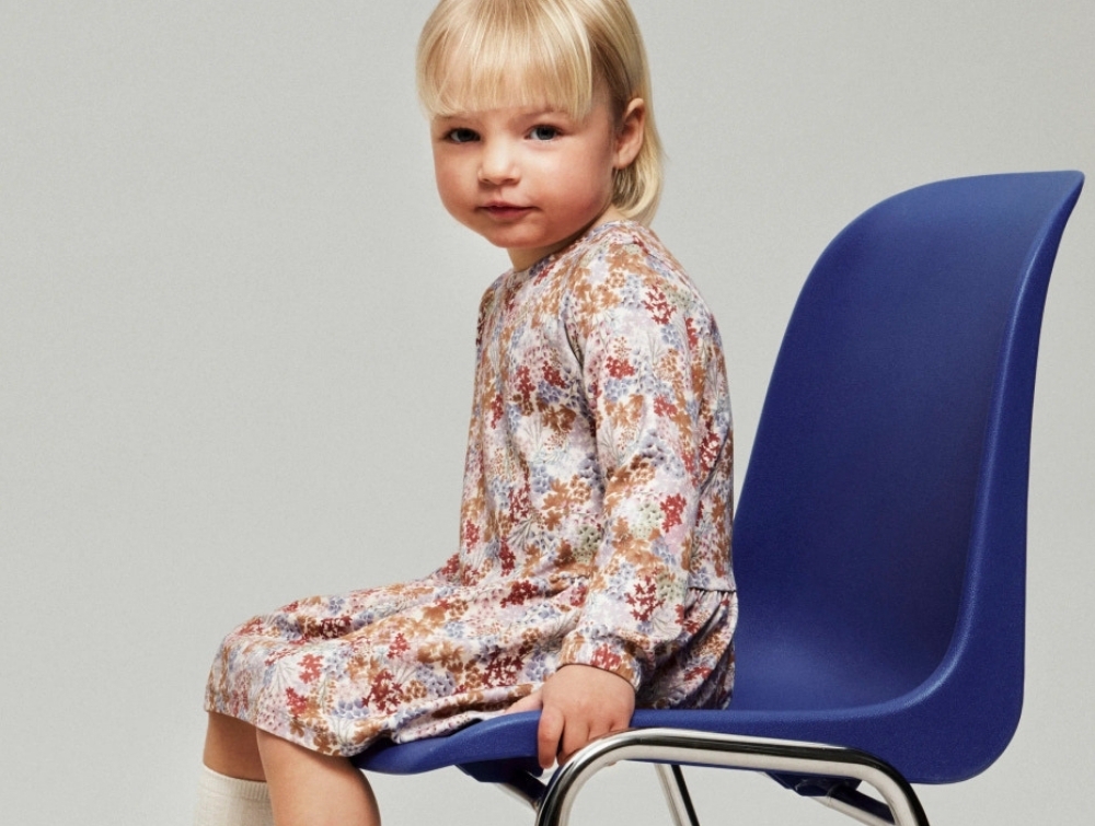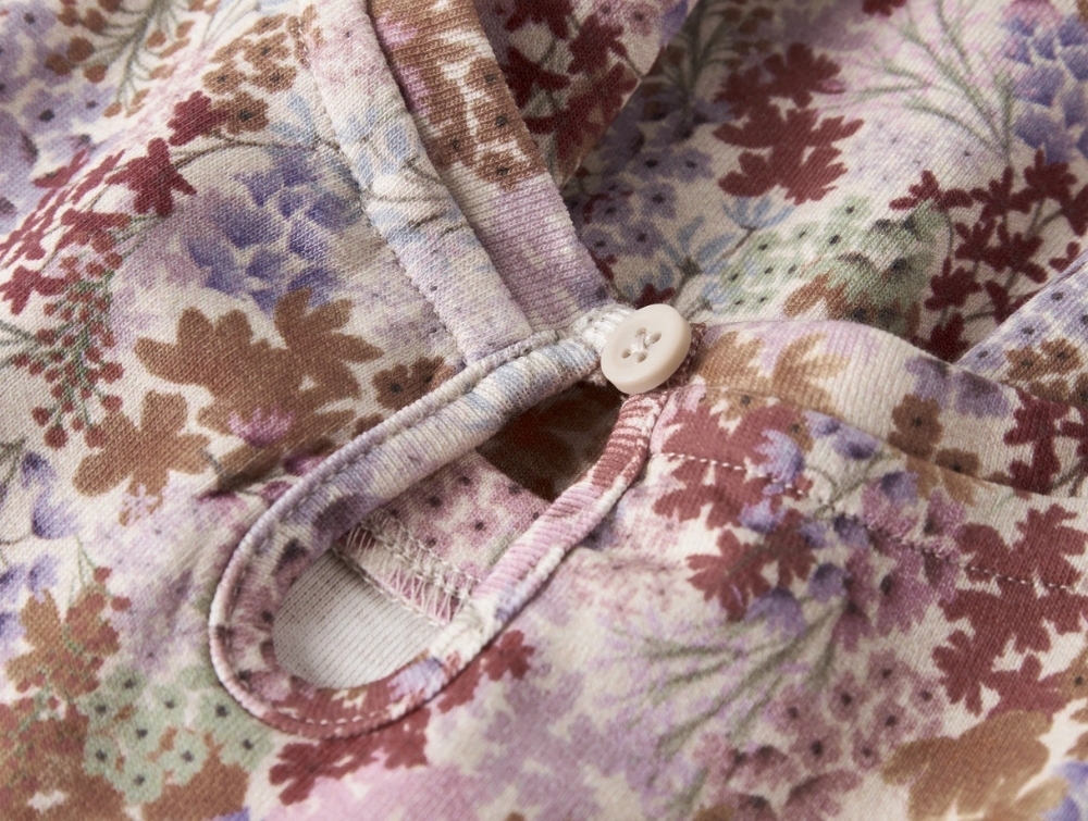 Kjolen har almindelig pasform med lange ærmer og elastik ved håndleddene. Den rynkede skæring i taljen giver let vidde i skørtet, og knaplukning i nakken gør den nem at få af og på.