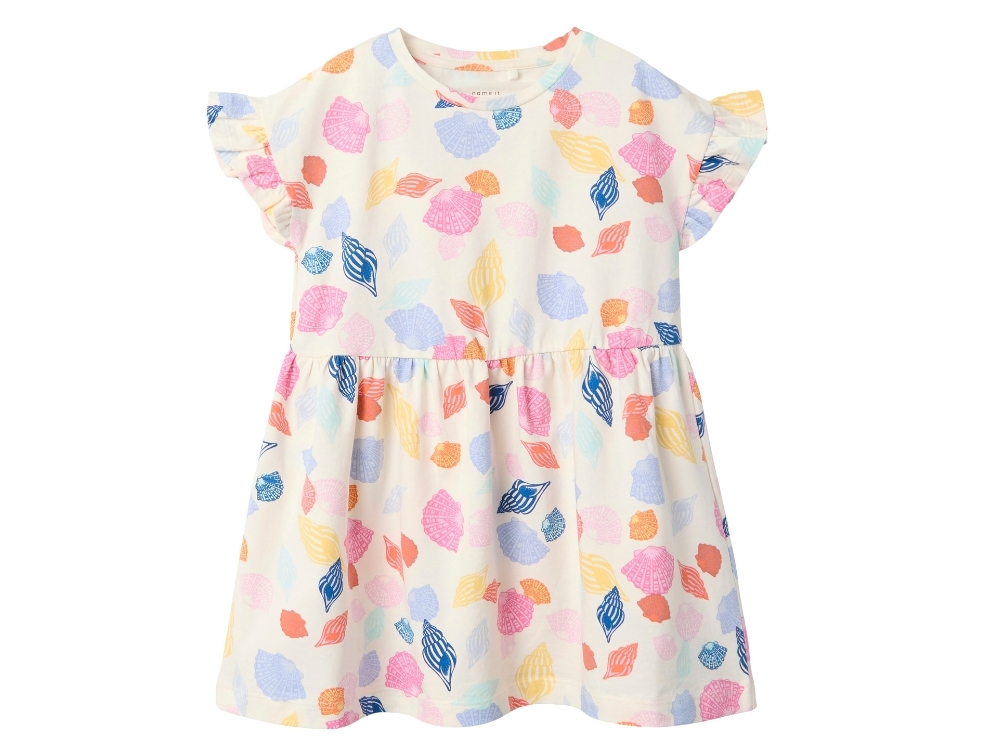 Kjole i råhvid nuance (sea salt) fra Name It. Modellen har farverigt muslingeskal-print og fine flæsedetaljer ved ærmerne.