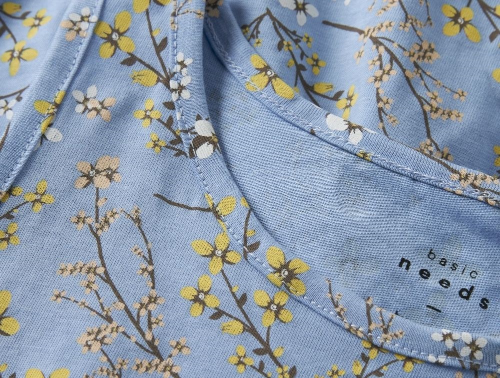 Kjolen er ærmeløs med rund hals og har en almindelig pasform. Den er lavet i blød og strækbar jerseykvalitet i 100% bomuld, som gør den både behagelig og nem at bevæge sig i. Det farverige blomsterprint tilføjer et frisk og sommerligt udtryk.