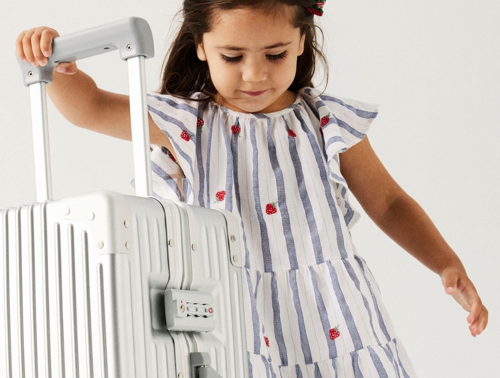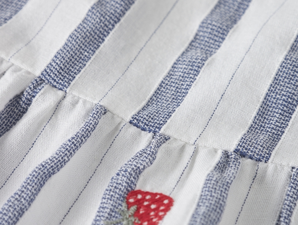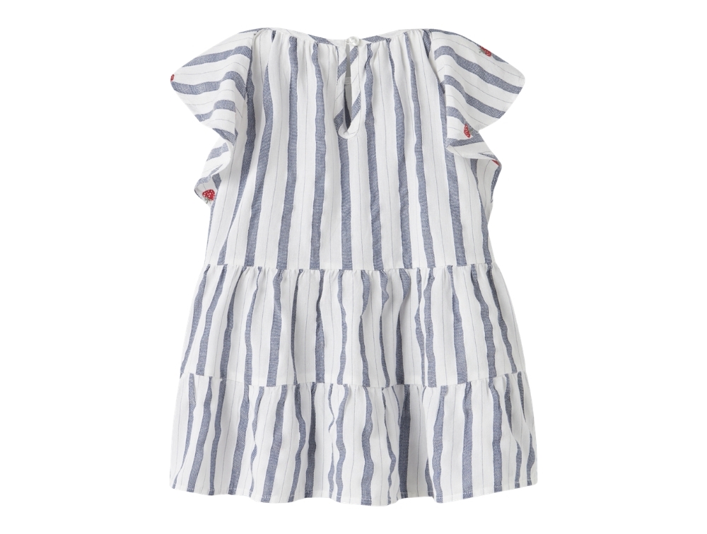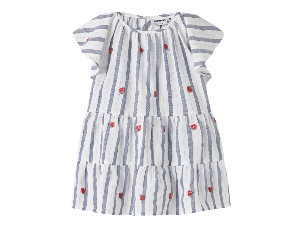 Designet har cap sleeves, rund hals og en løs pasform med lagdelt skørt. De små broderede jordbær giver et fint udtryk, mens knaplukning i nakken gør den nem at få af og på.
