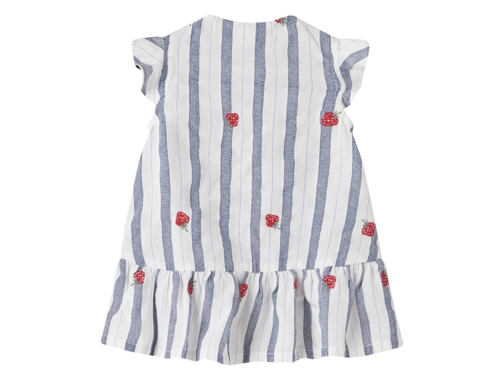 Lille pige iklædt Name It kjole i råhvid nuance med blå striber og jordbærName It kjole i råhvid nuance med blå striber og jordbærName It kjole i råhvid nuance detalje med striber og jordbærName It kjole i råhvid nuance med striber og jordbær bagfra