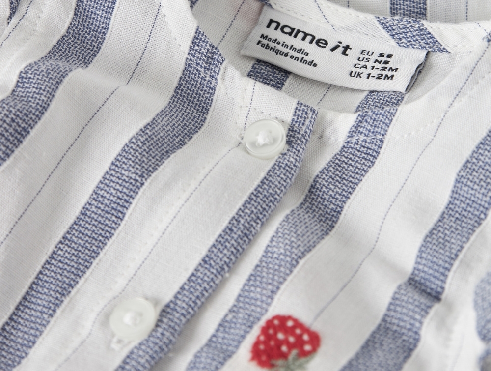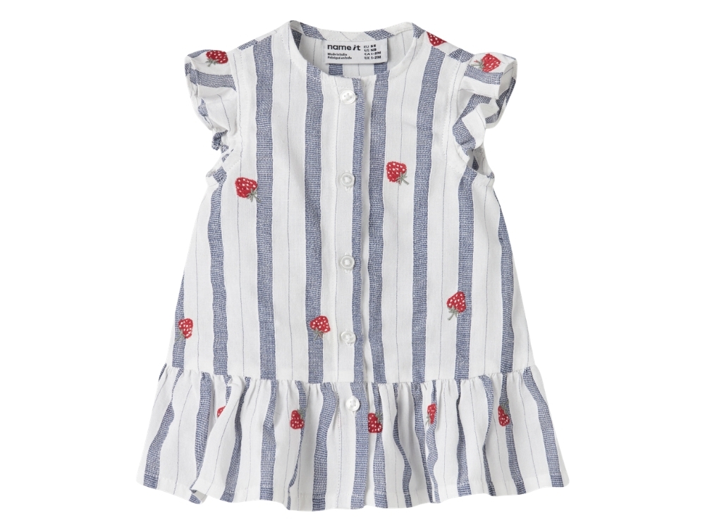 Designet har korte ærmer med små flæsedetaljer, rund hals og knaplukning foran. De lodrette striber kombineret med små jordbær giver et enkelt og dekorativt udtryk.