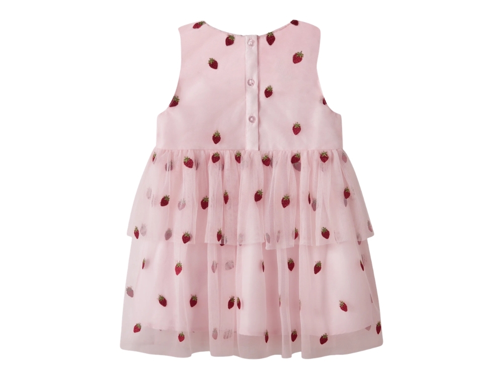 Designet er ærmeløst med rund hals og knaplukning i nakken. De lagdelte tylskørter og de små jordbærdetaljer giver kjolen et fint og ensartet udtryk.