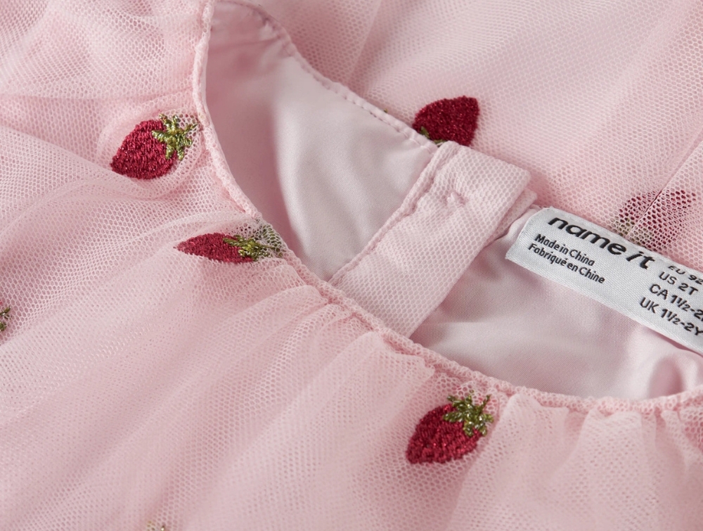 Name It kjole i lyserød nuance med tyl og broderede jordbær foranName It kjole i lyserød nuance med tyl og jordbærbroderi detaljeName It kjole i lyserød nuance med tyl og broderede jordbær set bagfra