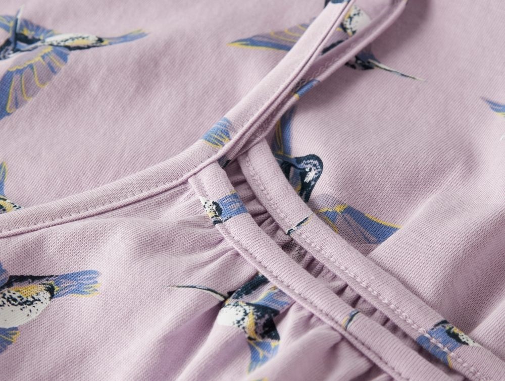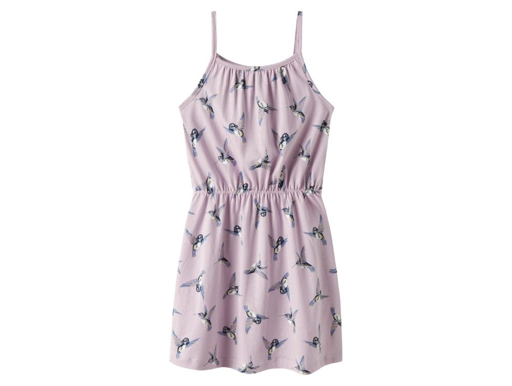 Name It kjole i lilla med kolibri-print og tynde stropper