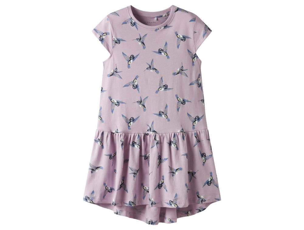 Kjole i lilla nuance fra Name It med all-over kolibri-print og rynket skørt