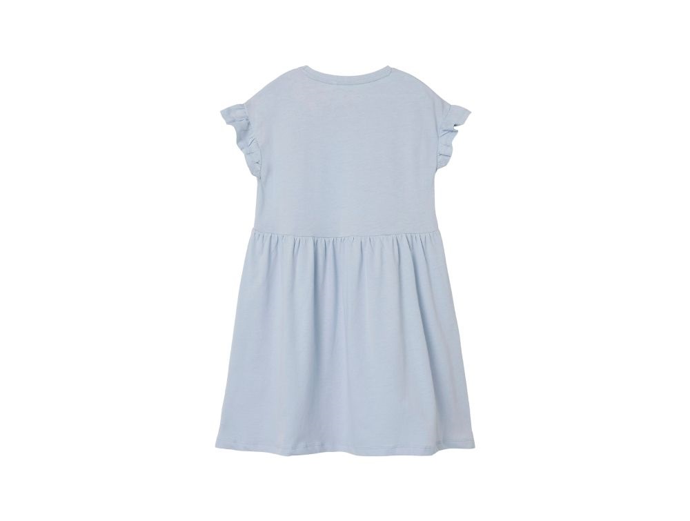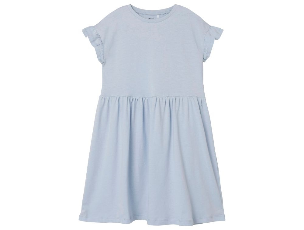 Lyseblå kjole fra Name It i blød jerseykvalitet med rund hals og pufærmer.