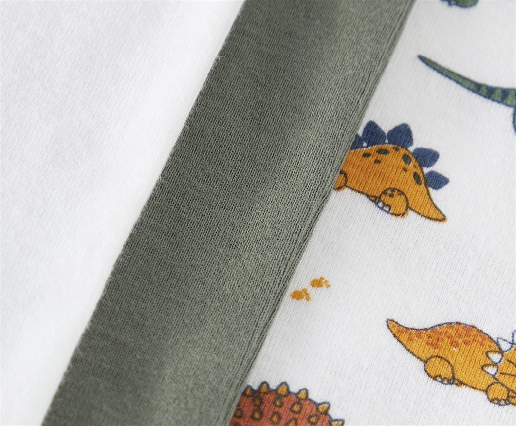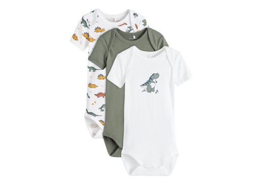 Pakken indeholder 1 ensfarvet grøn body, 1 hvid body med dinoprint og 1 hvid body med all-over dinoprint.