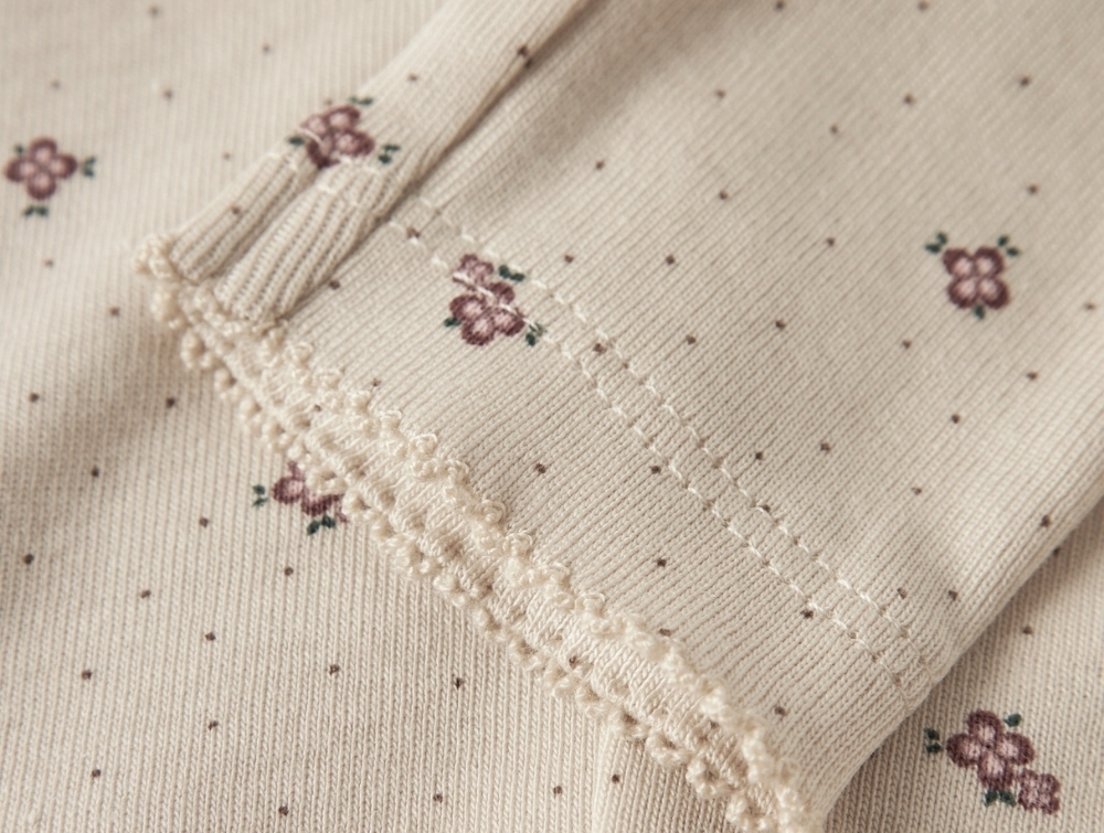 Designet er enkelt med smalle ben, små blomster fordelt over hele overfladen og en fin afslutning nederst ved benene. Den ribstrikkede kvalitet giver leggingsene et roligt og klassisk udtryk.