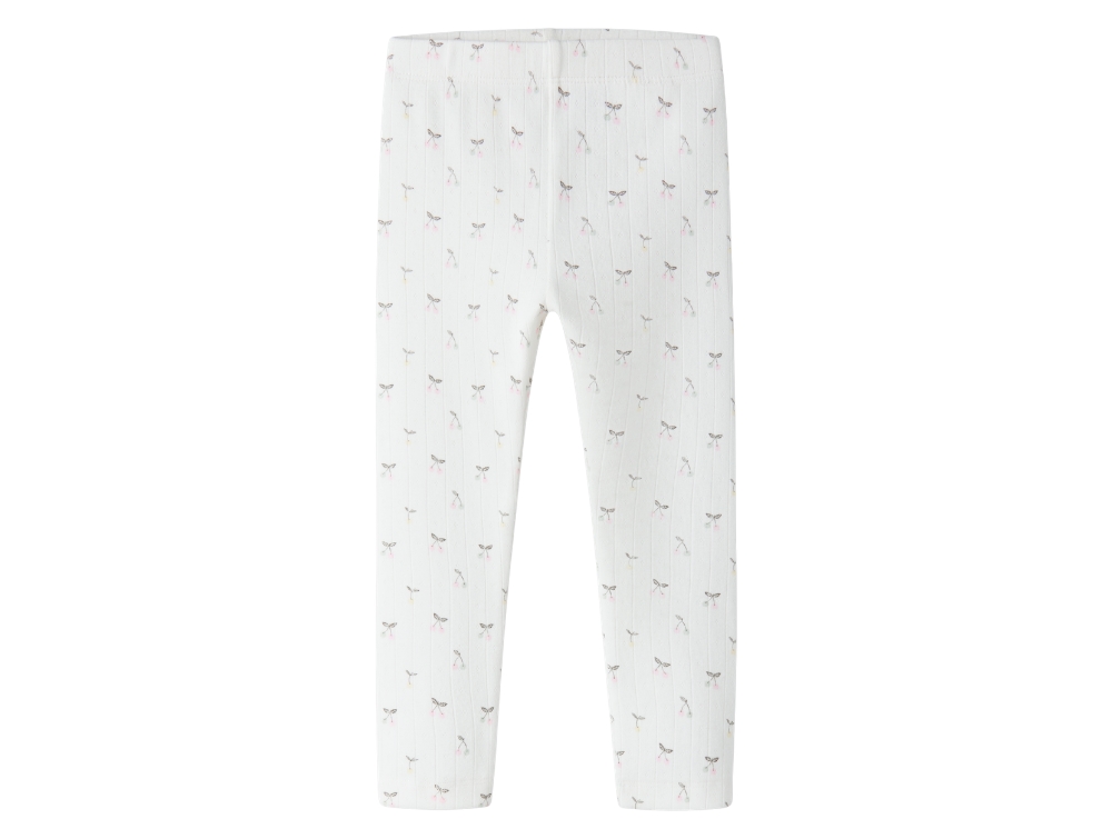 Leggings i råhvid nuance (cloud dancer) fra Name It med små kirsebærprint over hele overfladen.