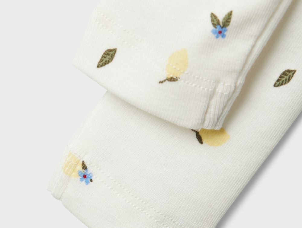 Leggings i en hvid nuance med fint print af små blå og gule blomster. Modellen har elastik i taljen og er lavet i en blød og strækbar kvalitet, der føles rar mod huden og giver god bevægelsesfrihed.