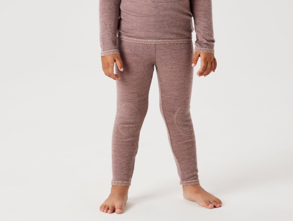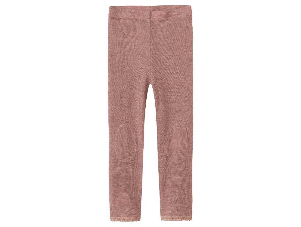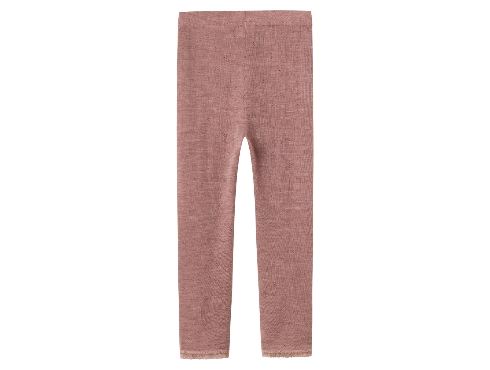 Leggings i støvet violet nuance (antler) fra Name It i merinould med hulmønster og blondekant.