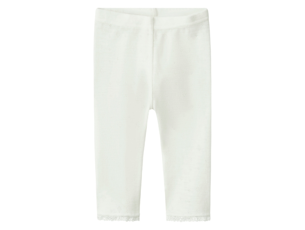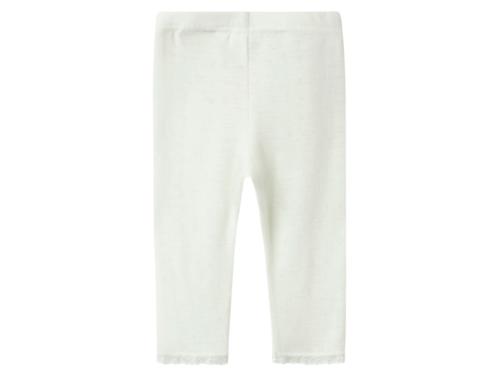 Leggings i råhvid nuance (snow white) fra Name It i merinould med hulmønster og blondekant.