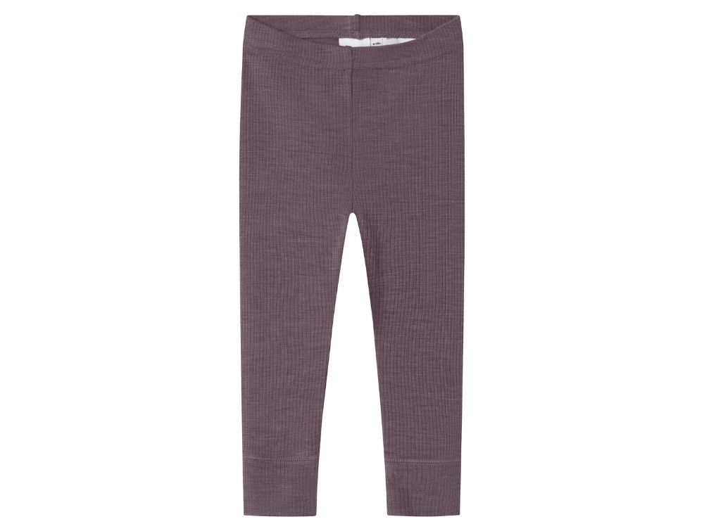 Leggings i mørk lilla nuance (sparrow) fra Name It i merinould med ribmønster.