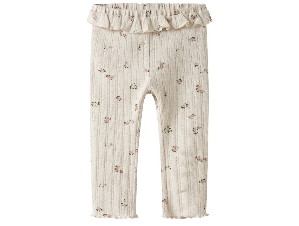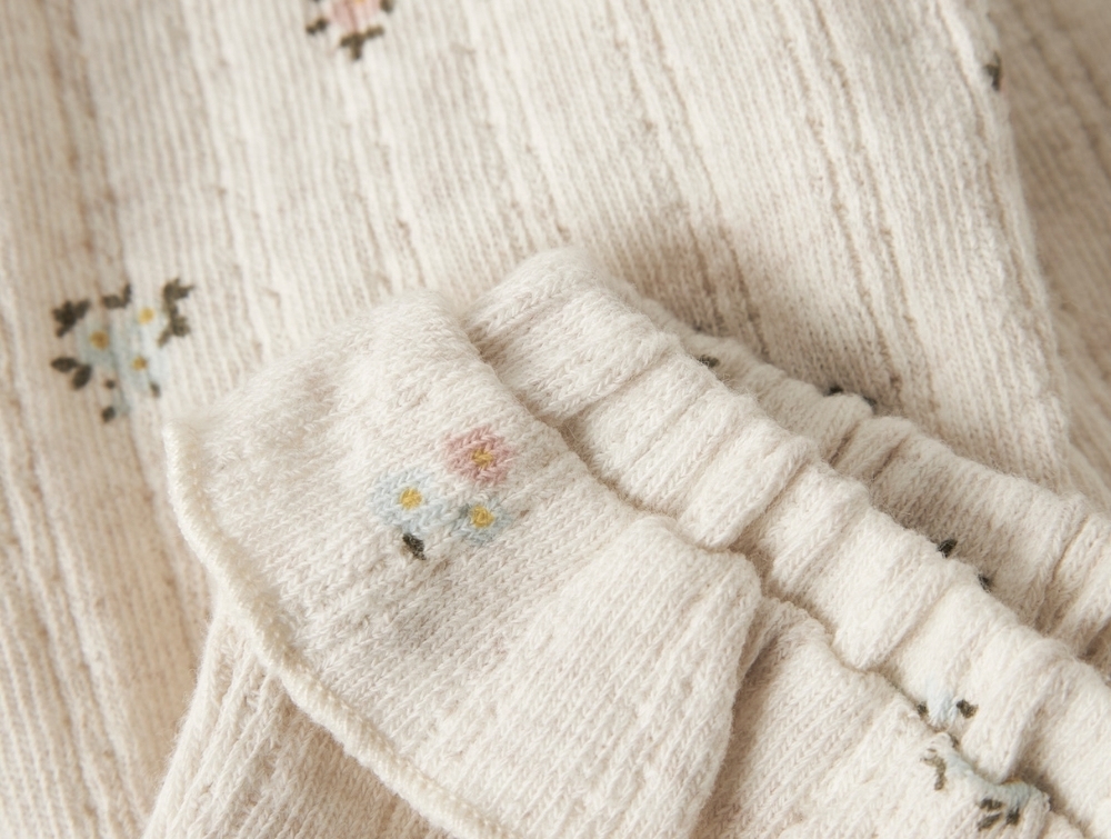 Leggings i råhvid nuance fra Name It med sødt pointellemønster og små blomsterprint. Det ribstrikkede materiale giver en blød struktur og god strækbarhed, så de føles behagelige for barnet at have på.