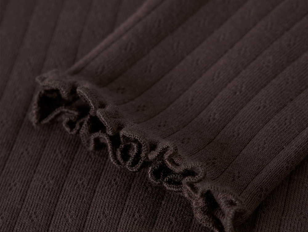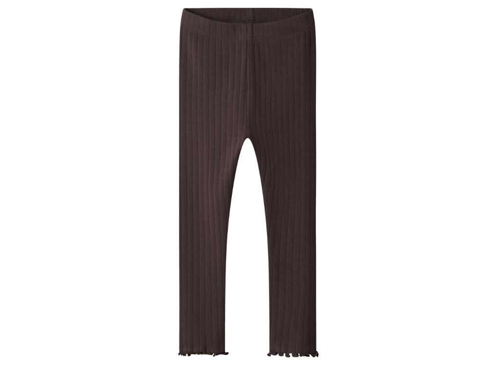 Leggings i mørkebrun nuance (seal brown) fra Name It med fine bølgede babylock-kanter ved benene.
