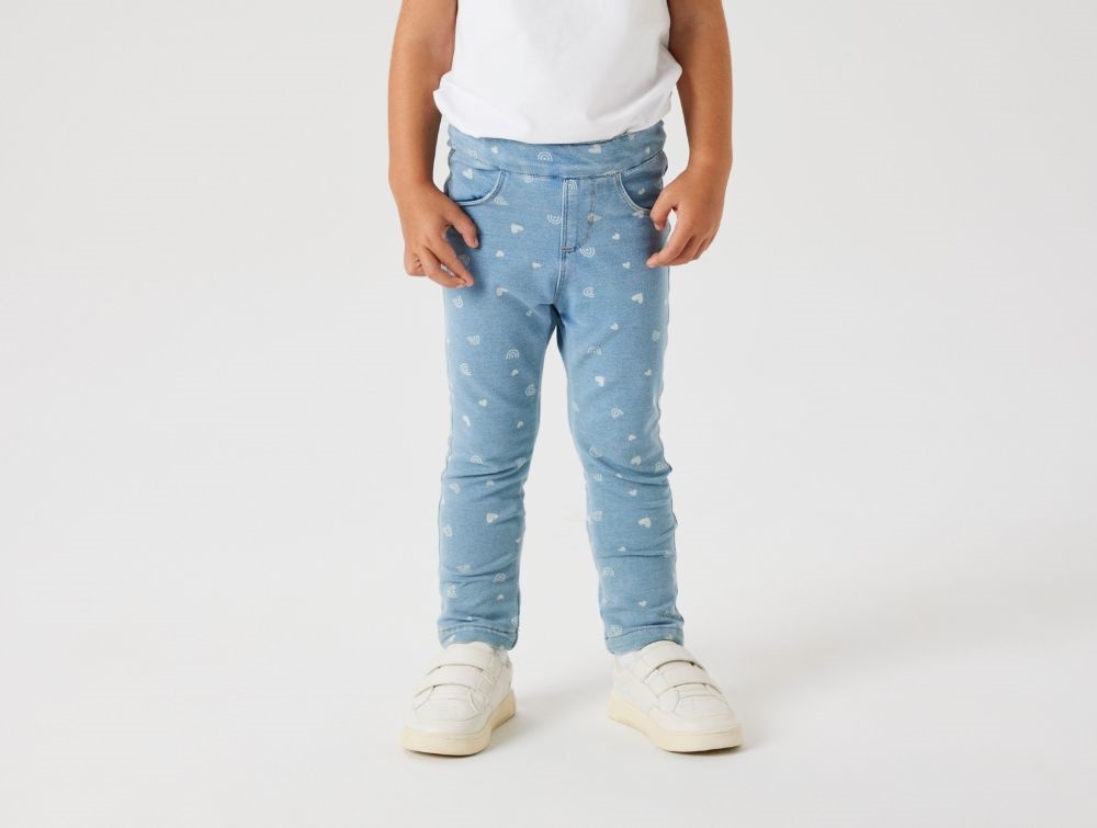Blød denim legging i farven light blue denim med hjerter fra Name It. Der er justerbar elastik i linningen, to snydelommer foran og to lommer bagpå.