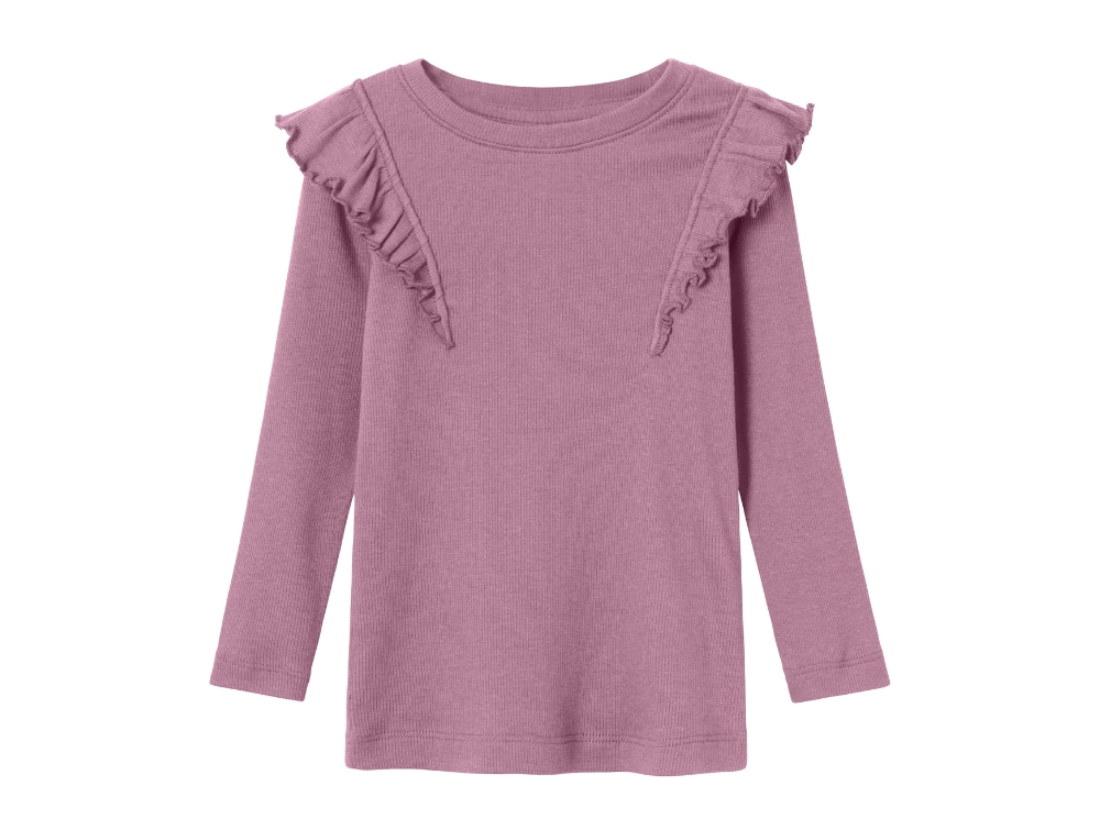 Langærmet top/bluse i farven mauve orchid med flæser fra Name It.