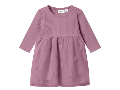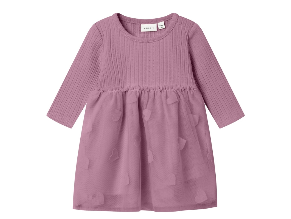 Kjole i farven mauve orchid med tylskørt med hjerter fra Name It.