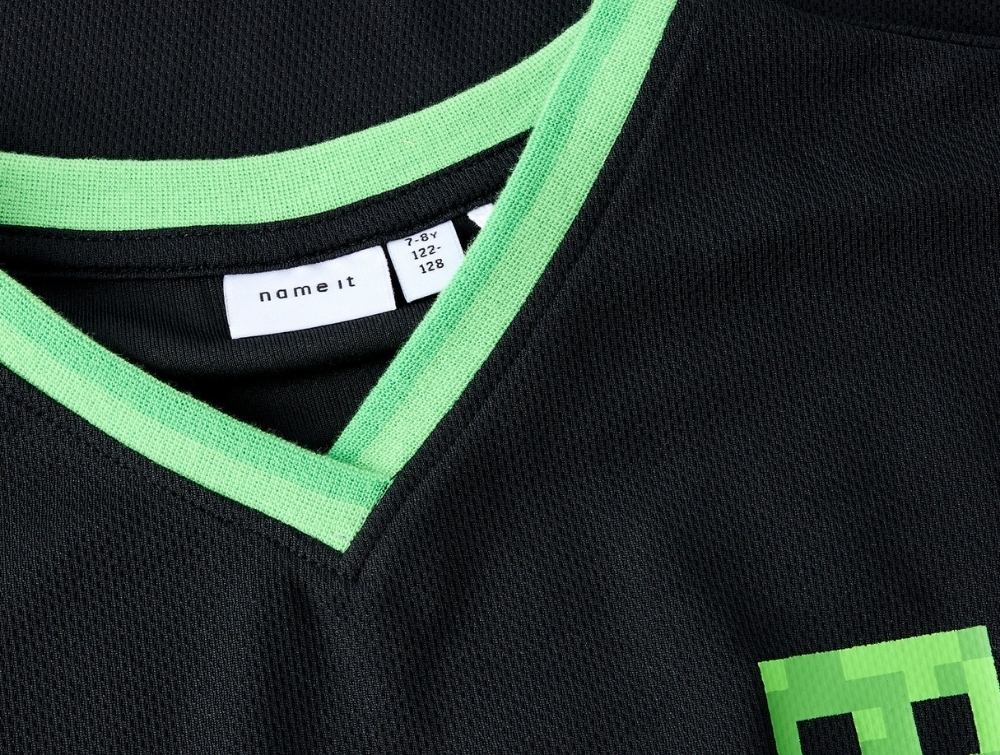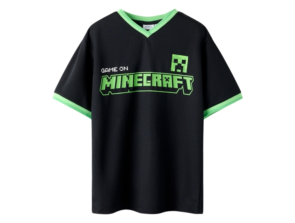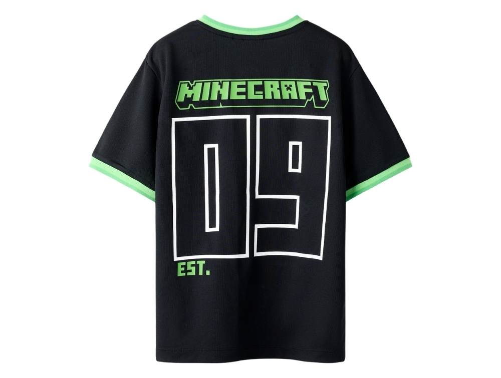 Designet har V-hals, korte ærmer med kontrastkant og et stort Minecraft-print på ryggen med tallet 09.