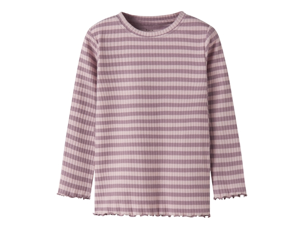 Langærmet bluse i støvet rosa og lilla striber (toadstool burnished lilac) fra Name It MINI. Lavet i blød, strækbar ribkvalitet, der giver en tæt og behagelig pasform med god bevægelsesfrihed.