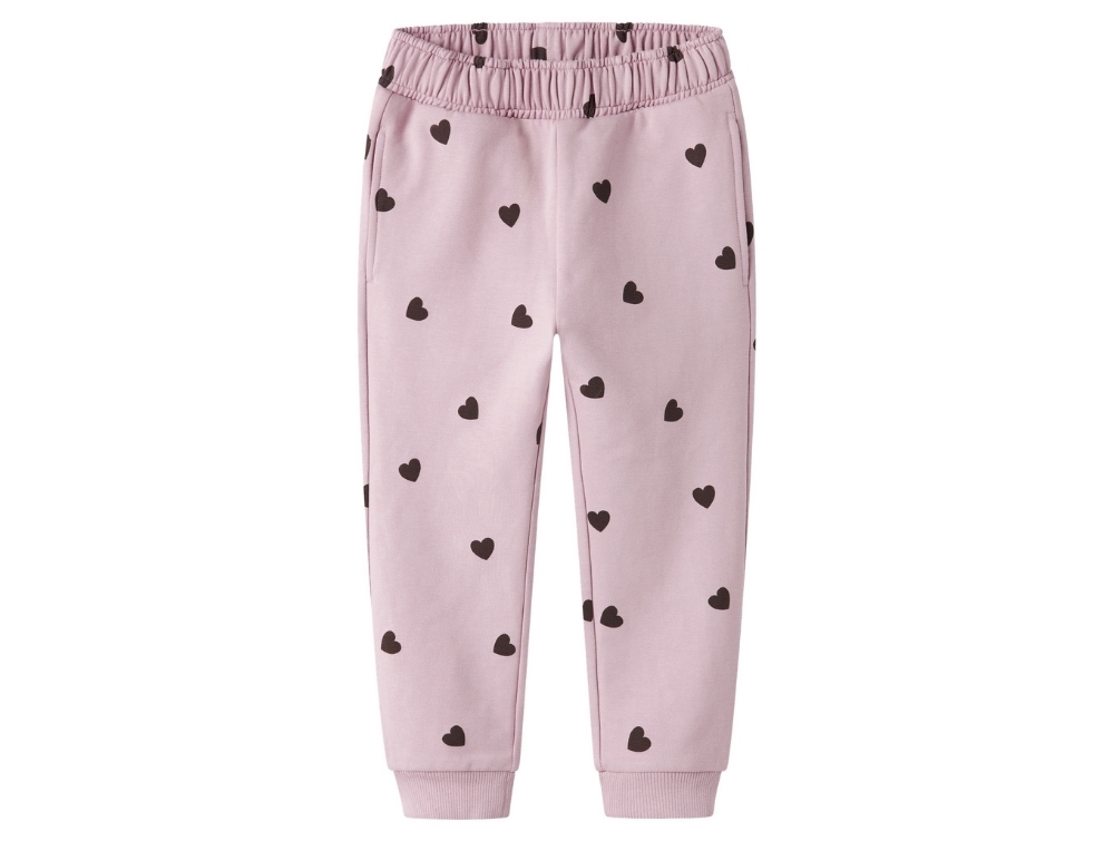 Bukser i lyserød nuance (burnished lilac) fra Name It MINI med sødt hjerteprint over hele stoffet. En blød og behagelig model, perfekt til leg og hverdag.