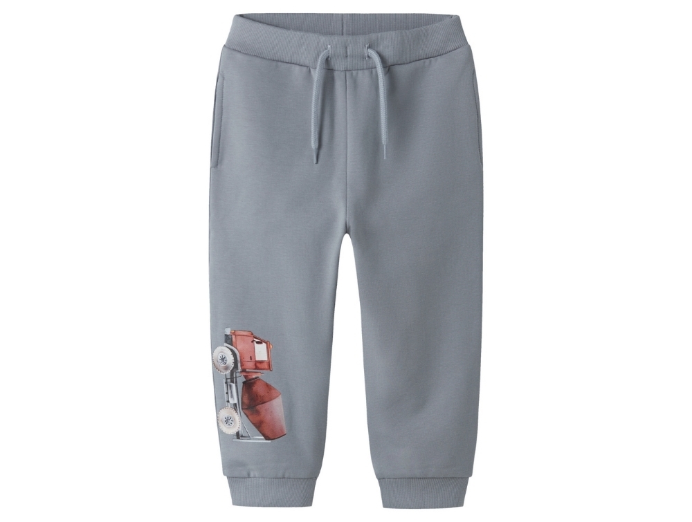 Bukser i støvet blå nuance (tradewinds) fra Name It MINI med stort lastbilprint nederst på benet. En blød og behagelig model i børstet sweatkvalitet, perfekt til hverdagsbrug.