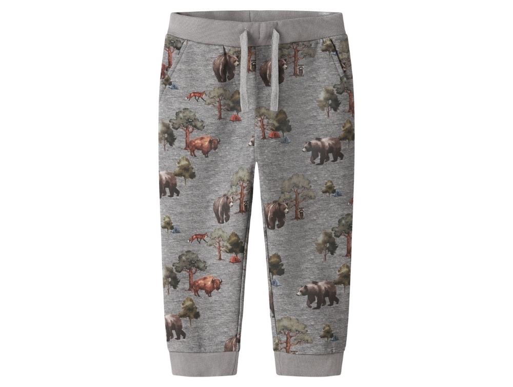 Bukser i grå meleret nuance (grey melange) fra Name It MINI med print af skovdyr som bjørn, ræv og bison. En blød og komfortabel model i børstet sweatkvalitet, der giver varme og bevægelsesfrihed.