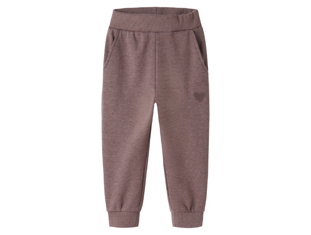 Sweatpants i lilla nuance (peppercorn) fra Name It MINI med diskret hjertebroderi på benet. Bukserne er lavet i blød, børstet sweatkvalitet med en lun inderside, der føles behagelig mod huden.