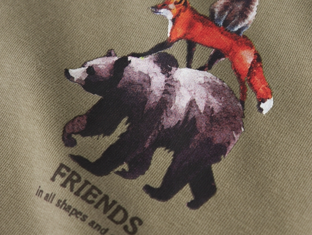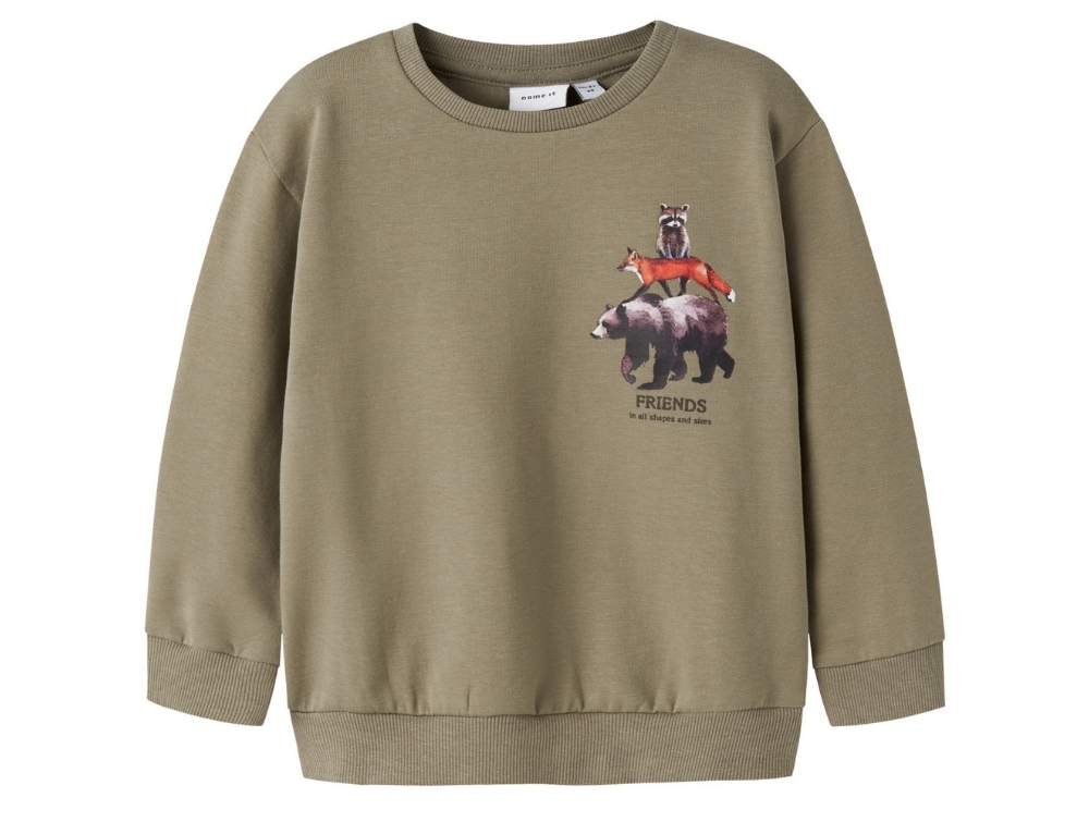 Sweatshirt i støvet grøn nuance (mermaid) fra Name It MINI med print af dyrevenner – bjørn, ræv og vaskebjørn – med teksten “FRIENDS in all shapes and sizes”. En blød og behagelig trøje i børstet sweatkvalitet, perfekt til leg og hverdag.
